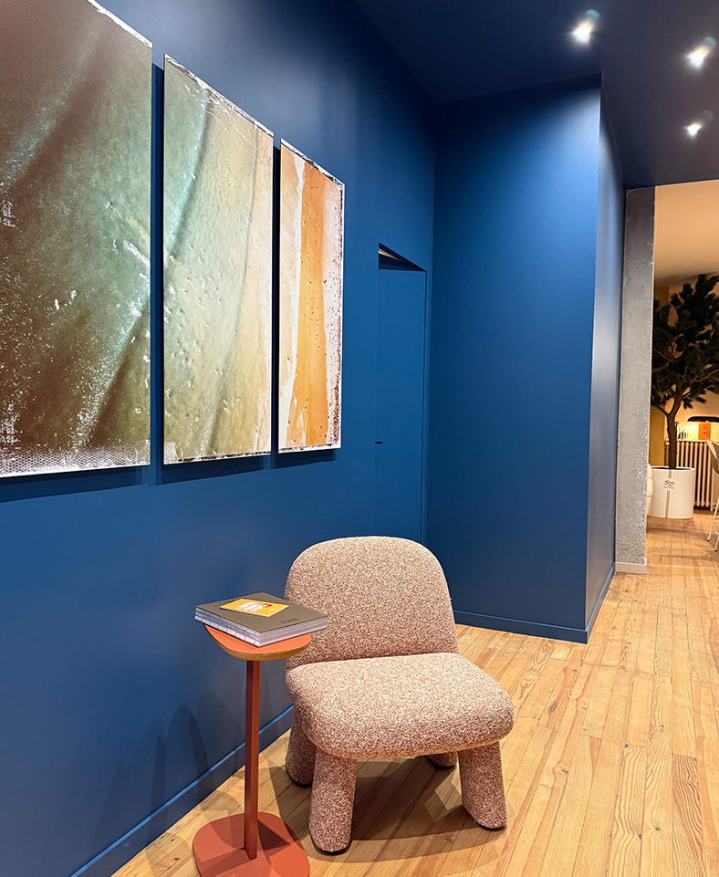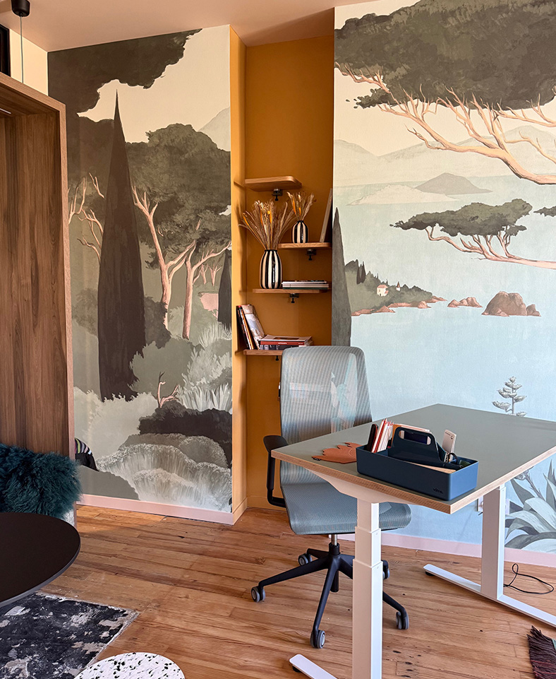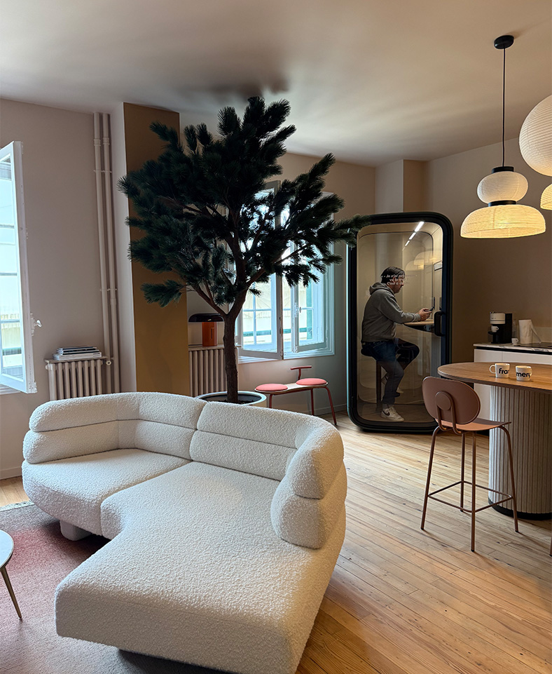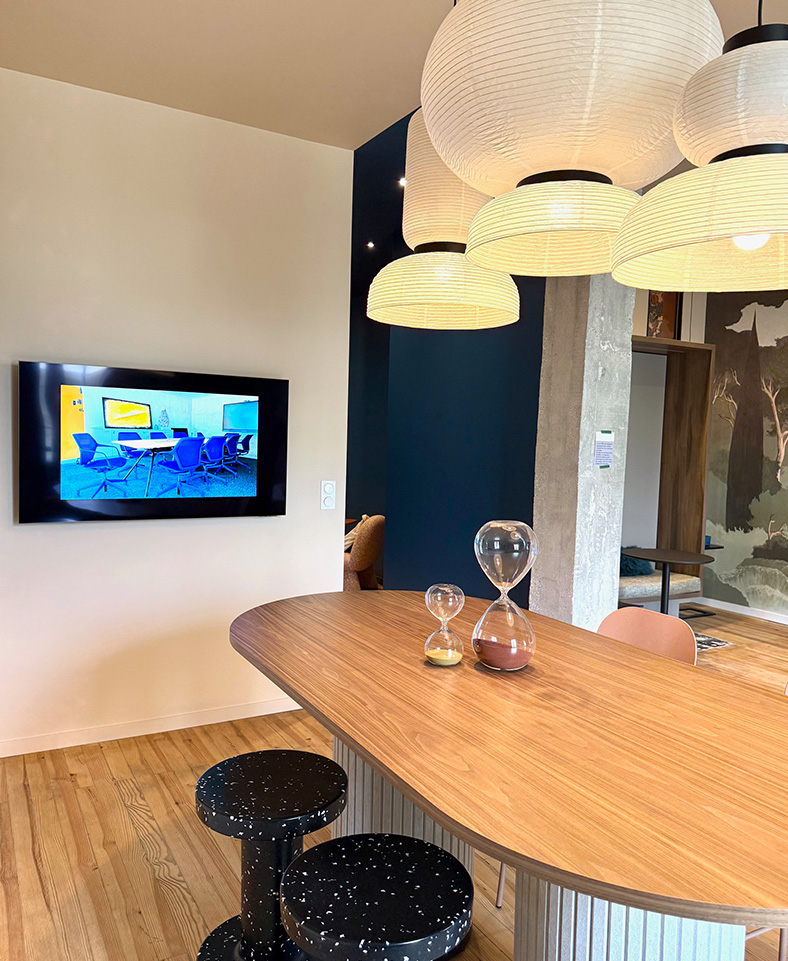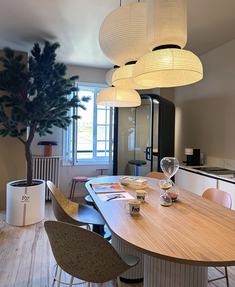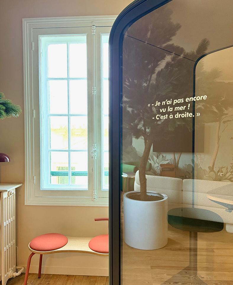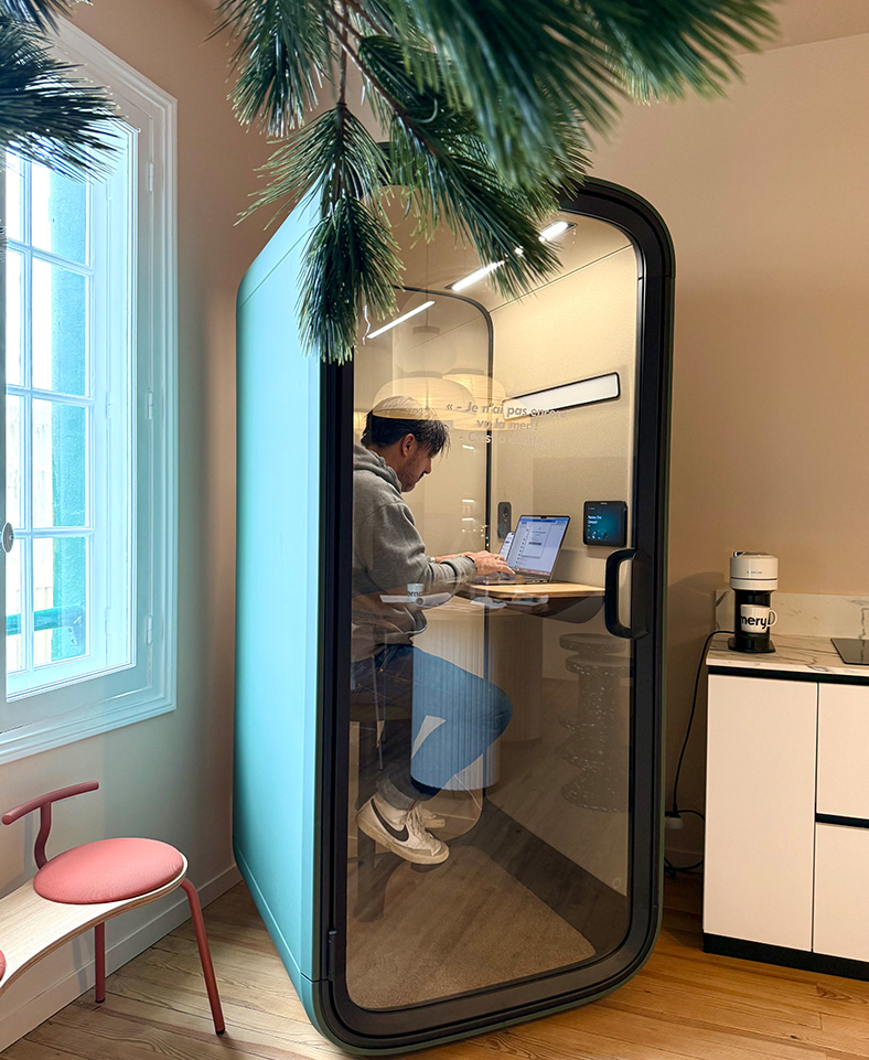 Déployé sur 75 m², 1927 work ocean s’organise autour de six espaces complémentaires, pensés comme un parcours d’usages fluide et cohérent. Dès l’entrée, le sas bleu agit comme un seuil de recentrage. La cabine acoustique Framery One Compact garantit un espace 100 % confidentiel pour les appels sensibles, les visios stratégiques et les temps de concentration. Une creative room permet d’échanger à deux, de cadrer un projet ou de décider rapidement, tandis que le salon de travail, à l’esprit « habitat » repensé, accueille le collectif dans une posture active et confortable.