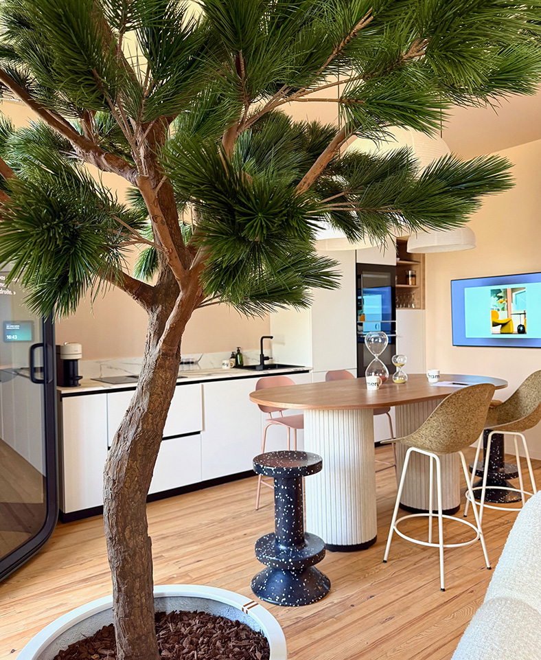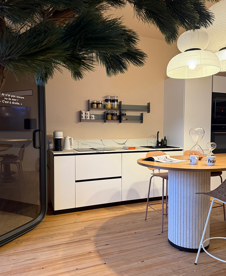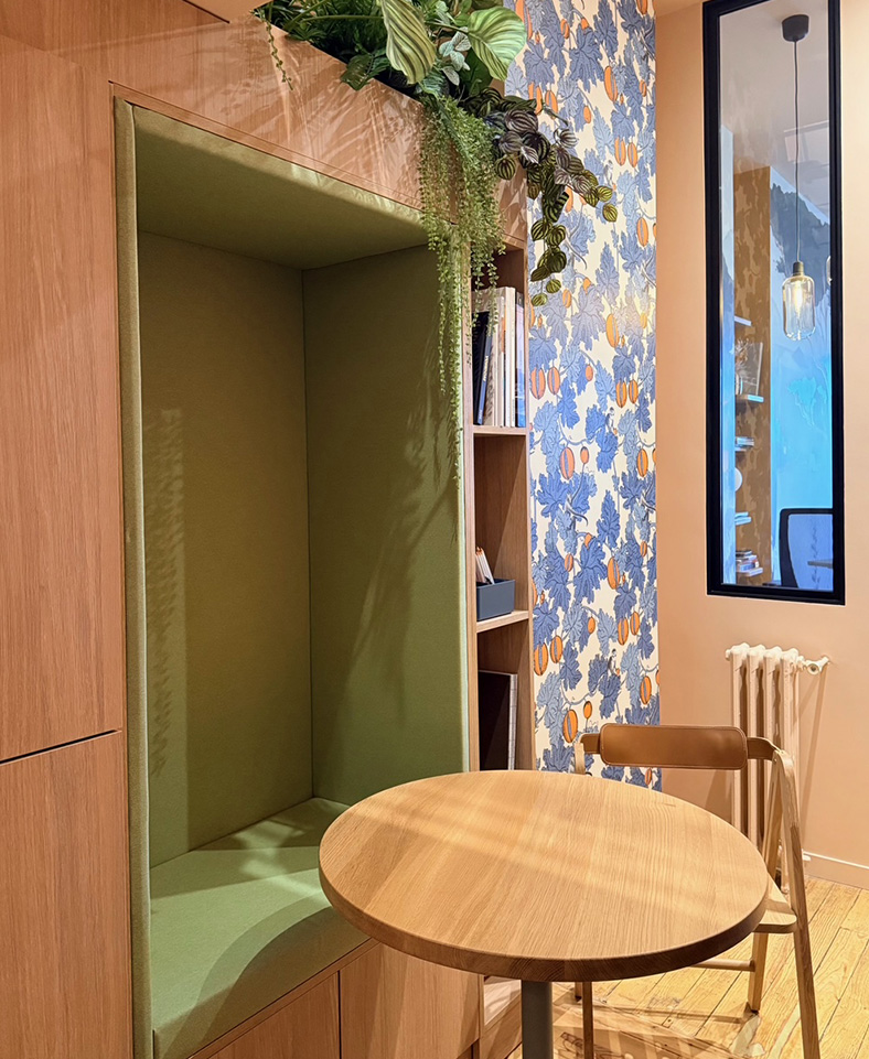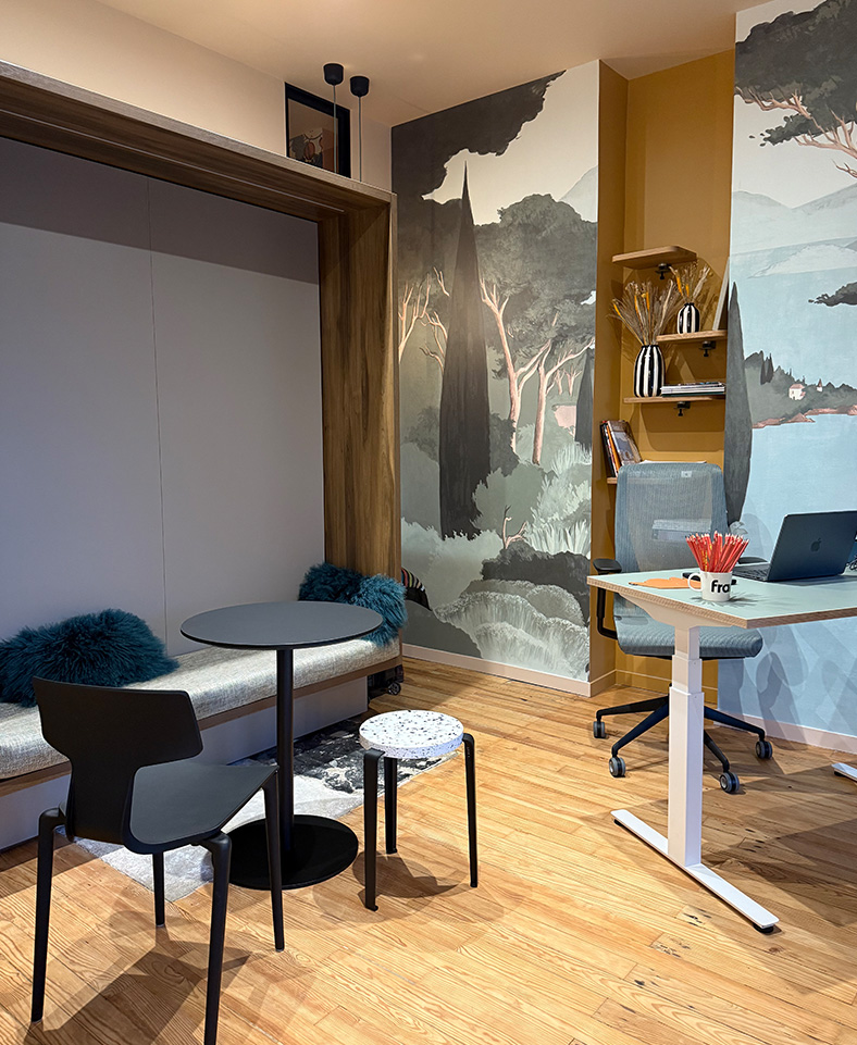 Au cœur de l’appartement de travail, la cuisine multiposture devient un véritable hub collaboratif, équipée pour les réunions hybrides et les visioconférences partagées grâce à un système visio intégré permettant de connecter équipes sur place et à distance. Une alcôve de travail, associée à un bureau réglable en hauteur et orientée vers un écran mural, complète le dispositif pour le travail en duo et les visios confortables.