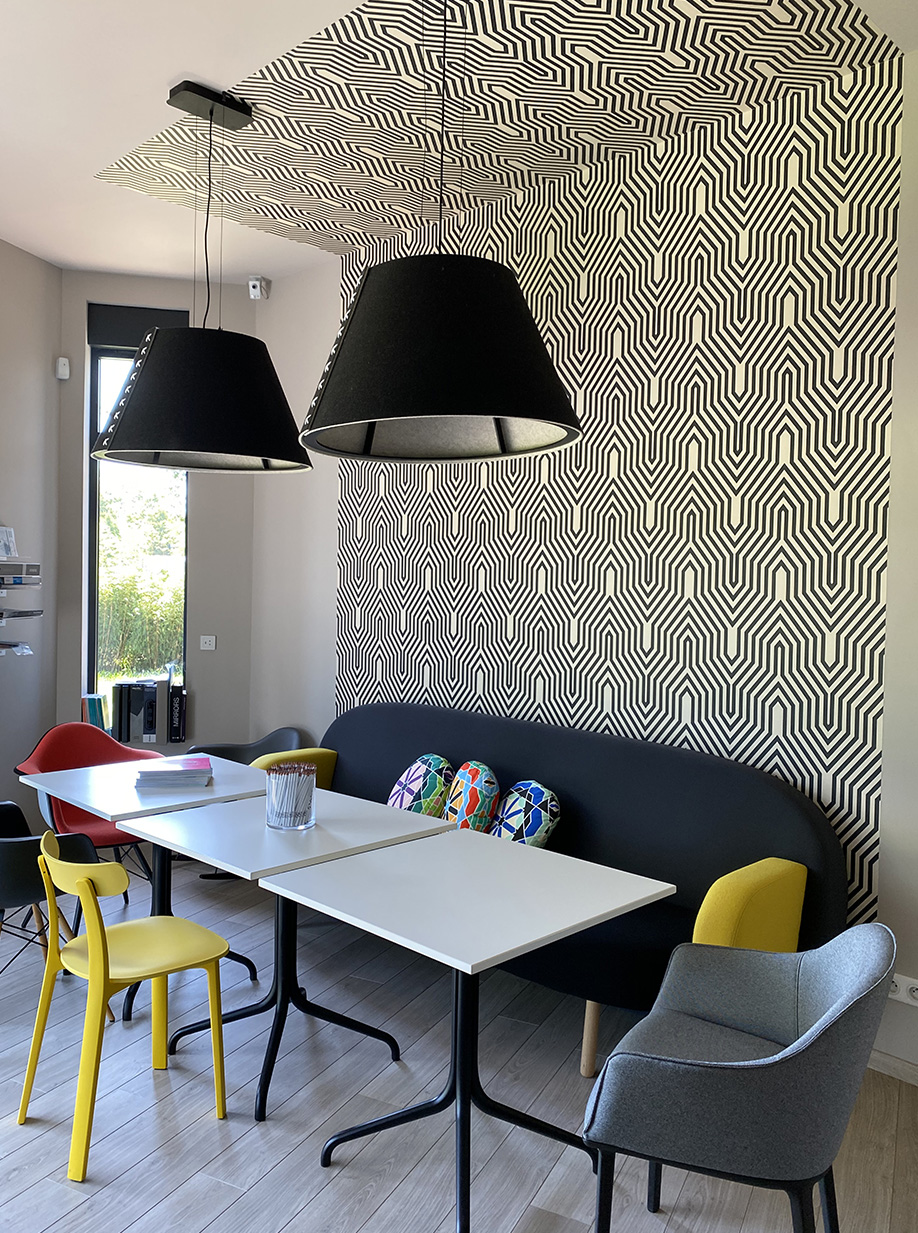 La petite équipe de l’agence œuvre dans des bureaux de plus de 200 m² construit comme une maison : une entrée centrale desservant à gauche, les espaces de travail et à droite, les espaces de services tels que la cuisine, les toilettes et les archives. Qu’il s’agisse d’accueillir en rdv client sur la terrasse par un bel après-midi de printemps ou encore de faire un goûter et de débriefer en cuisine, il faut créer un nouvel espace permettant notamment de téléphoner ou recevoir en toute confidentialité.