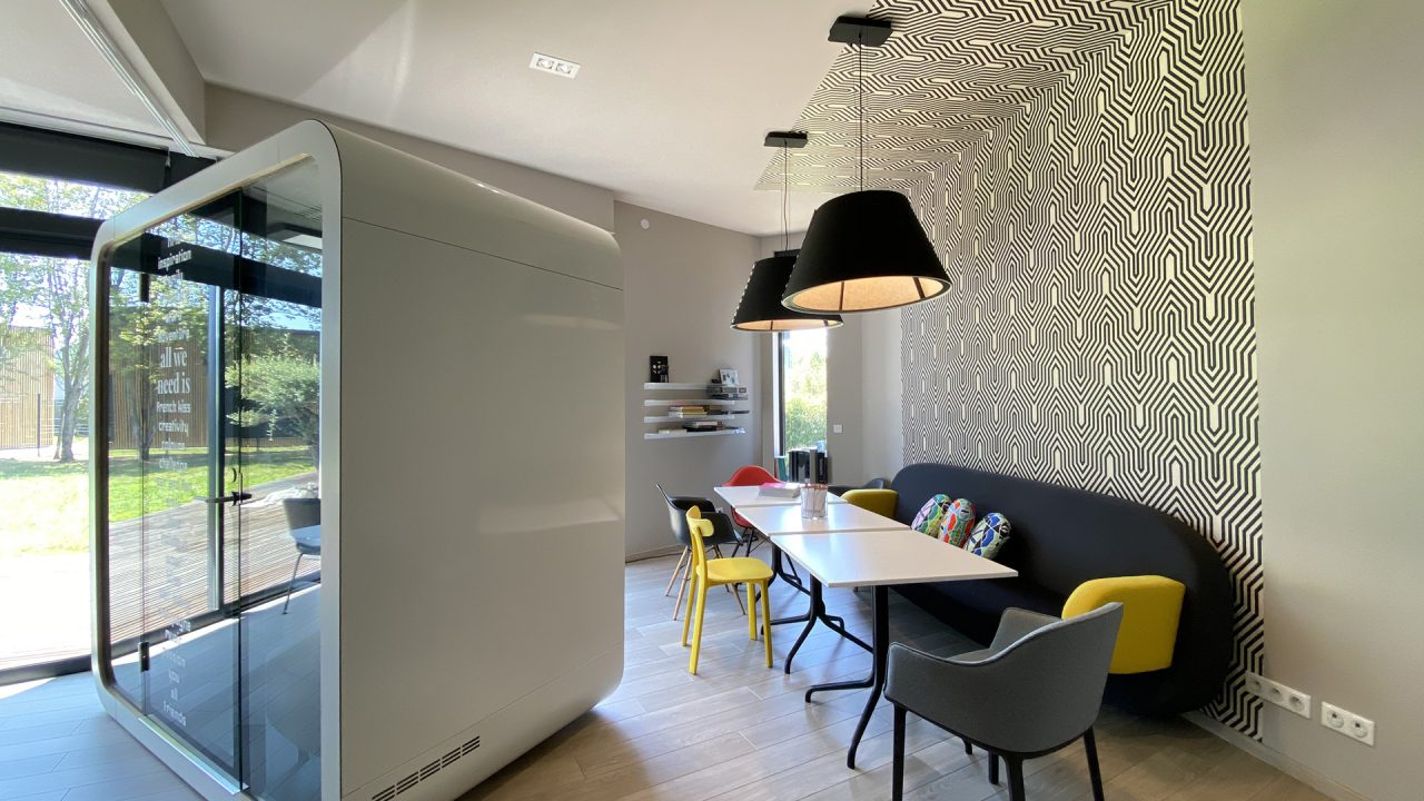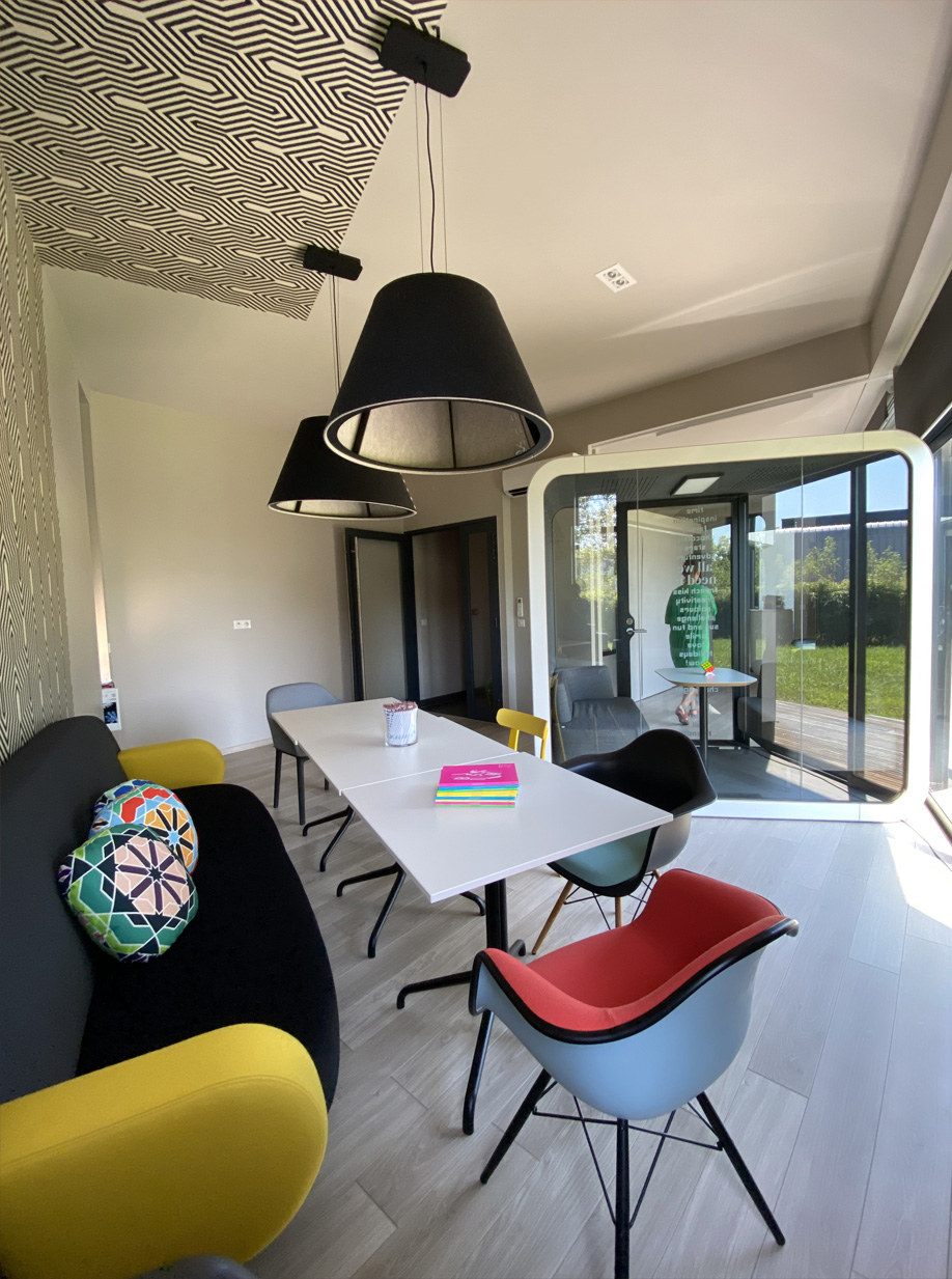 Une framery Q Maggie Meeting prend place au beau milieu de l’espace cuisine pour offrir un nouvel espace dans l’espace. Il est 100 % confidentiel et acoustique, ouvert sur l’extérieur grâce à ces baies vitrées qui permettent de ne pas se sentir étouffé une fois à l’intérieur. Ce micro-espace permet à tous de partager les RDV et échanges téléphoniques confidentiels tels que les entretiens individuels, les interviews pour le magazine Blossom que l’agence créé ou encore les échanges entre associés. Au-delà, les jours de grandes réunions, il n’est pas impensable de venir un instant y défatiguer son oreille. Véritable paravent, cette cabine permet de séparer l’espace en 2 autres, avec des destinations bien distinctes : la cuisine où gâteaux et café sont souvent de mises et un nouvel espace bistrot recevant réunions, débrief, présentations… Chaque semestre la créativité de l’agence s’applique sur les vitres de la Framery, histoire de communiquer toujours, un peu, beaucoup, passionnément, follement…