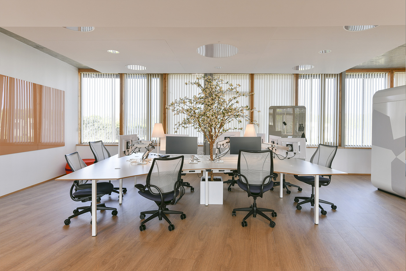 Après le degré 339, c’est à l’aménagement du coworking degré 20 du bâtiment anneau de Teréga que Studio 512 s’affaire en collaboration avec les Moyens Généraux pour la DTDP. Distribuée en 2 grandes zones (2 et 4) reliées par un hall, chaque hémisphère est pensée comme un espace unique appartenant à un tout. Il faut répondre aux nouveaux besoins des équipes tout en poursuivant les collections de mobilier déjà sollicitées tout en restant innovant et créatif. Dans ces nouveaux espaces, l’assis-debout fait l’unanimité des équipes avec les bureaux Float de Humanscale. Dotés d’un mécanisme de contrepoids brevetés, ce mobilier permet sans effort à l’utilisateur d’alterner entre la position assise et la position debout.
