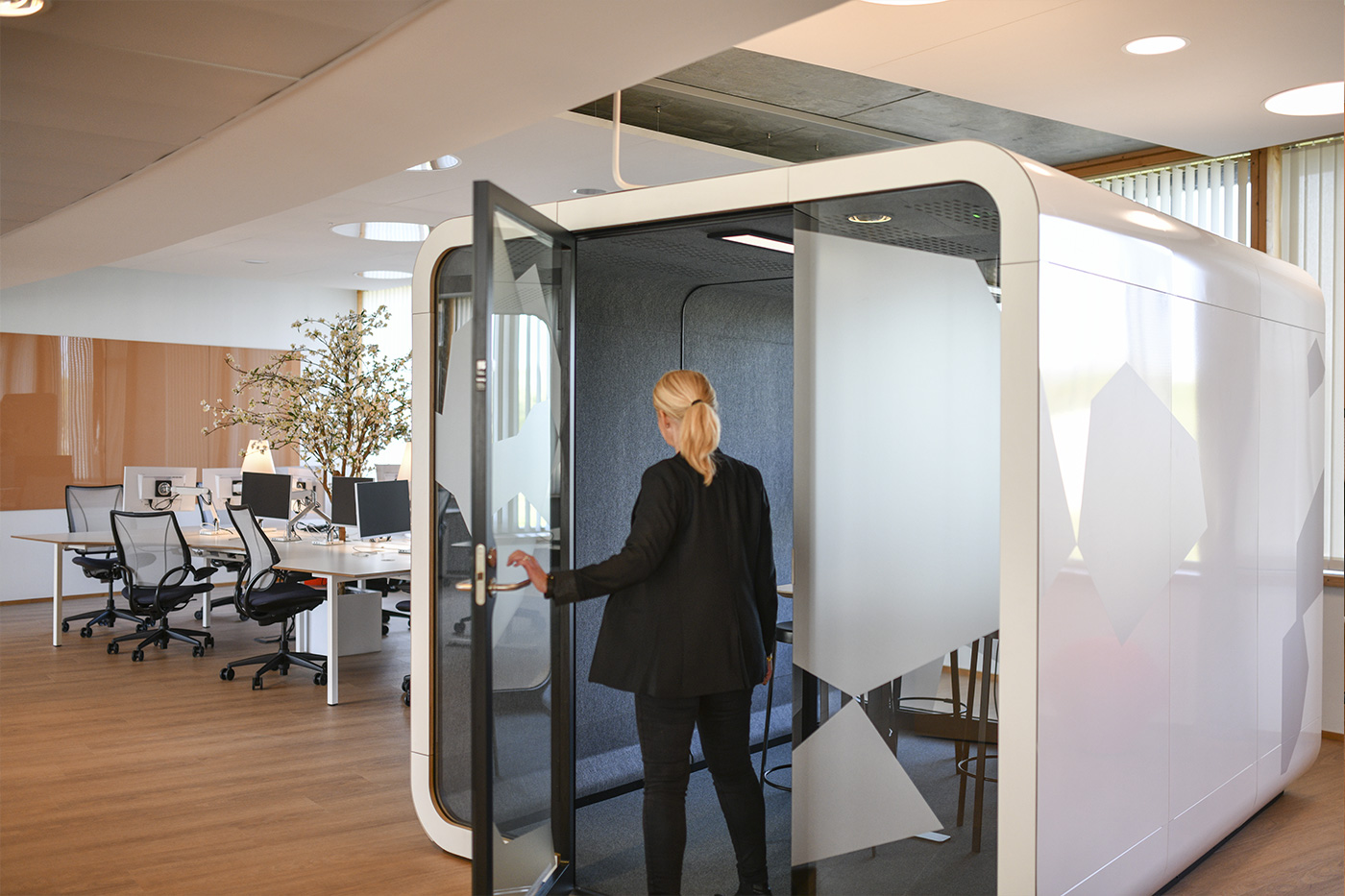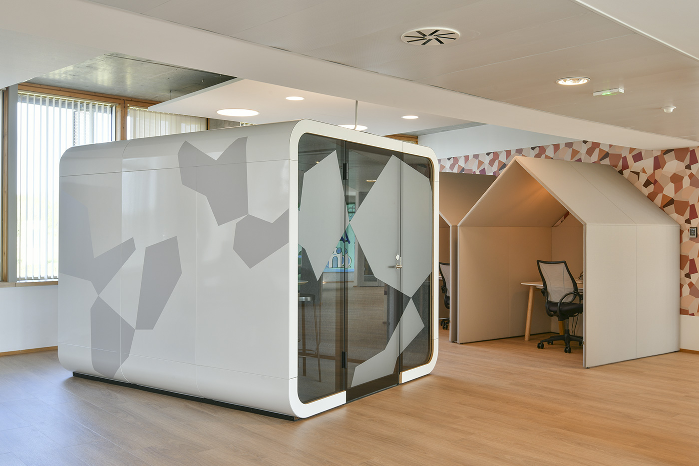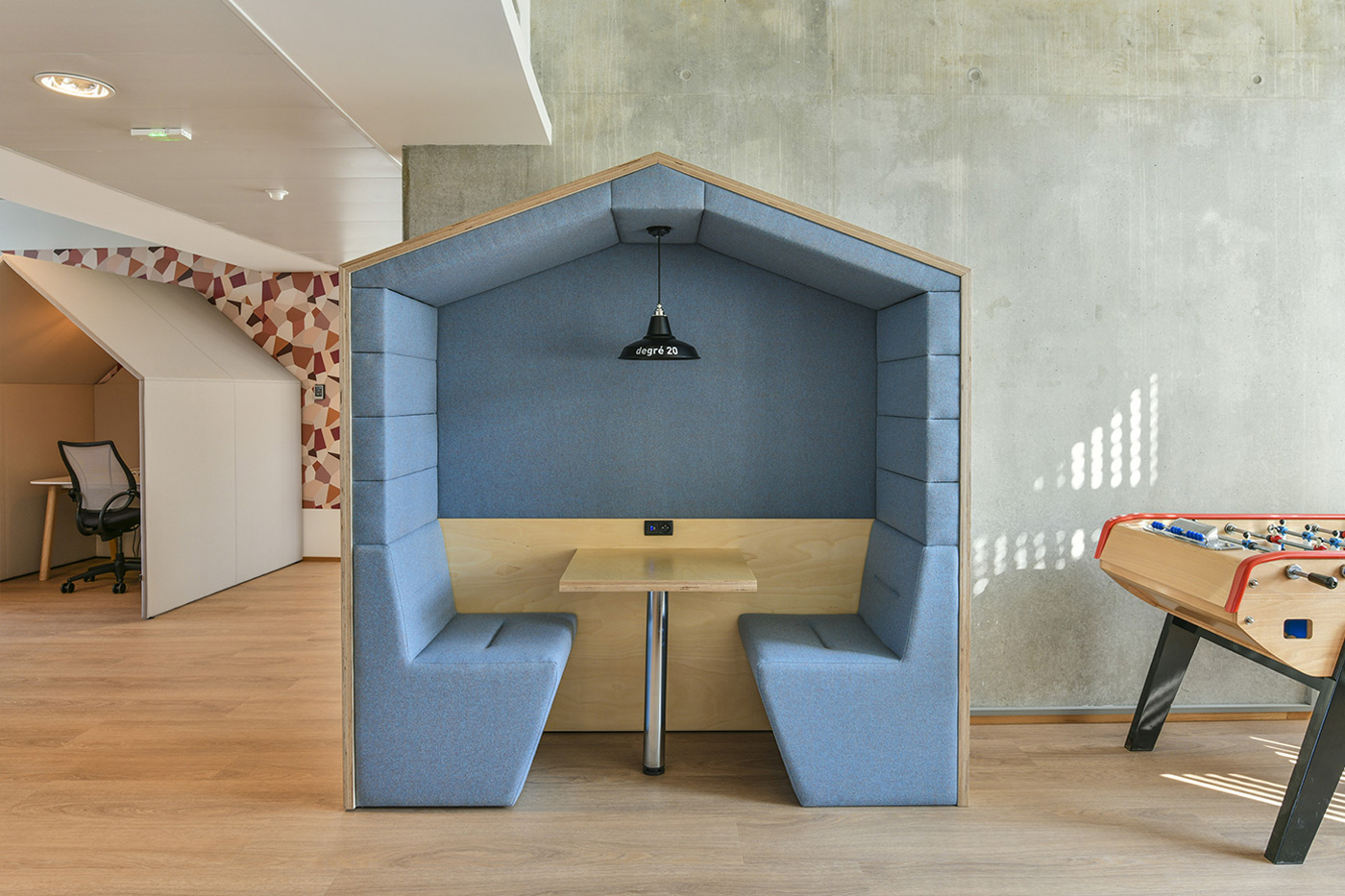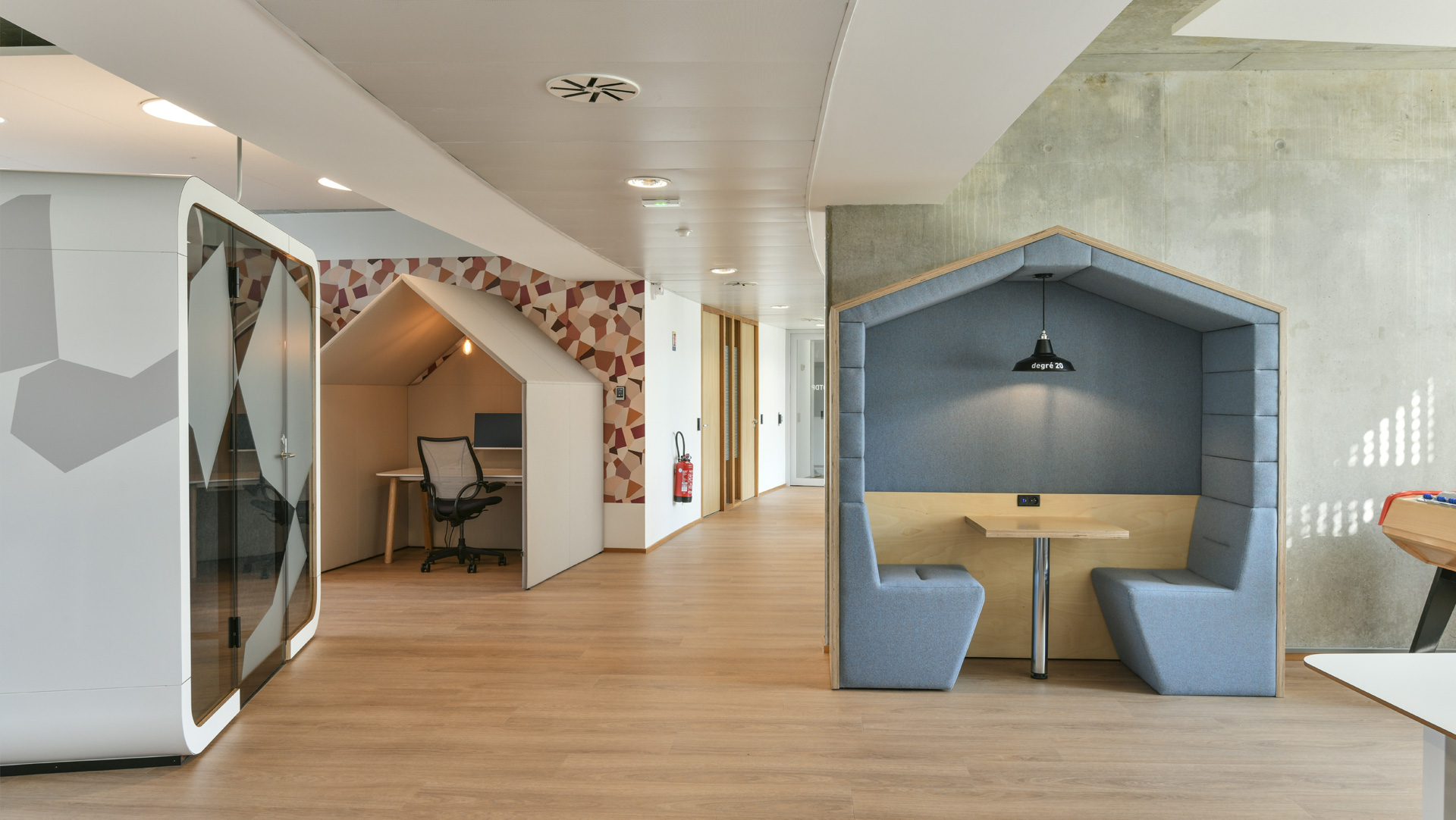 Une cabane dans le bureau ? Oui et alors ! Grâce à sa configuration semi-acoustique et à sa connectique, elle participe au changement des nouveaux modes de travail en entreprise en permettant un point d’échange en face to face, rendez-vous improvisé, debrief de quelques minutes…