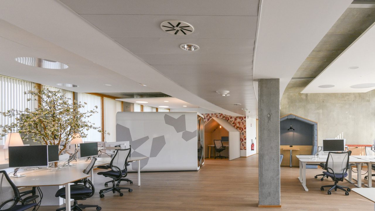 210 m2 de coworking à aménager selon deux principes de base : le sharing desk (partage d’un même bureau par plusieurs personnes à des moments différents) pour répondre à la flexibilité « présentielle » et le clean desk (bureau propre et rangé) autour desquels se déclinent de l’assis-debout, des espaces semi-acoustiques et acoustiques ou encore une bibliothèque où le mot d’ordre est de présever le silence.
