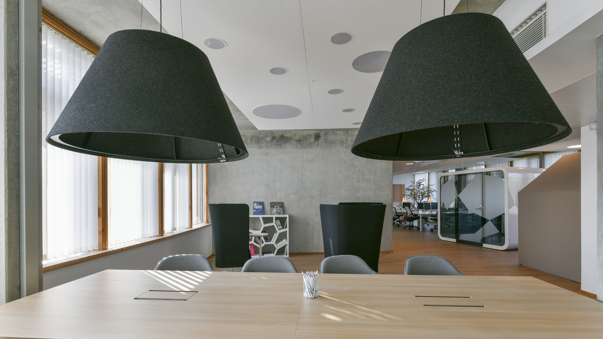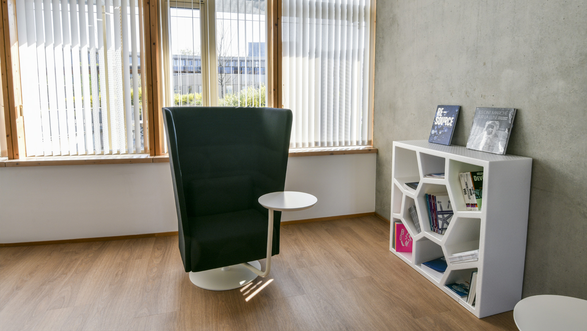 À la bibliothèque, trois postures silencieuses sont à l’honneur. Ici, on tchèque ses mails, en silence, attablés connectés à la grande table. On prend aussi place, pour une lecture plus confidentielle, dans les fauteuils pivotants Cell 128 de Sitland, sélectionnés pour leurs hauts dossiers enveloppants permettant de s’isoler pour travailler, le portable posé sur une petite table parfaitement positionnée pour un gaucher comme pour un droitier. Plus loin, de manière bien plus informelle, ce sont les fauteuils Cabala de Softline qui, par l’inclinaison de leurs dossiers, offrent une part d’intimité non négligeable pour celui ou celle qui y prend place.