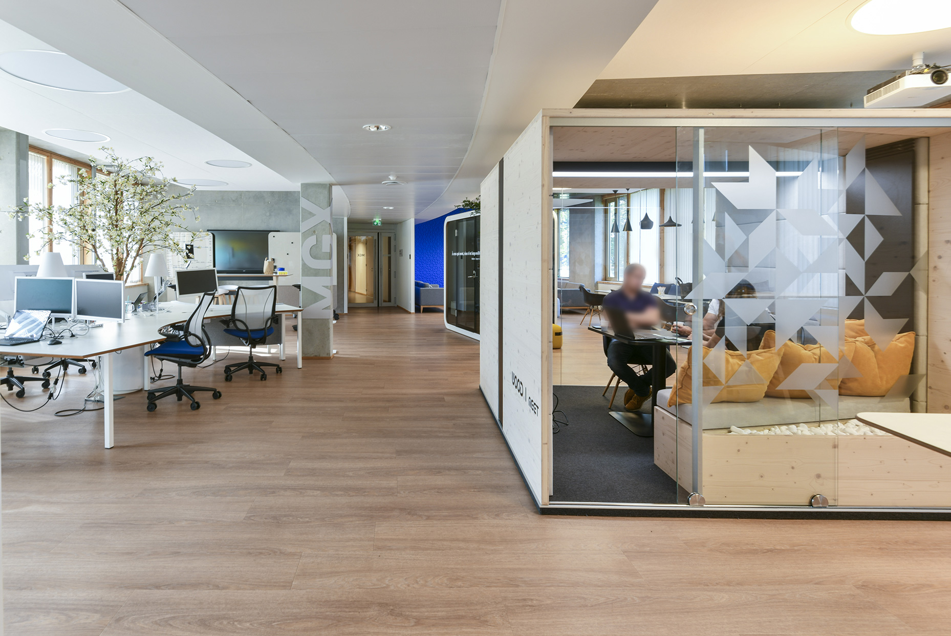 L’espace MGX a été pensé et créé pour échanger de manière informelle, autour d’un café, au salon comme au bistrot connecté, travailler autour d’un bench au milieu duquel un cerisier en fleur – pour faire entrer la végétation à l’intérieur du bureau – ou encore en « face to face » dans un micro-espace acoustique ou semi-acoustique. Accueillir, se réunir, collaborer, s’isoler en toute confidentialité… des typologies adaptées à une équipe et des usages retranscrits pour valider un mobilier qui fait sens au-delà d’être design.