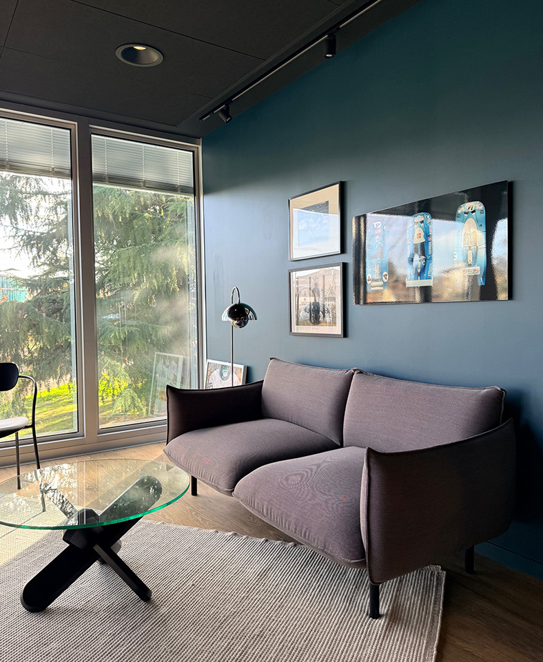 Un siège social pensé comme un lieu vivant et incarné où le patrimoine prend plusieurs formes. Celui des œuvres de Michel Brunoro, placées de manière stratégique pour dialoguer avec les espaces et insuffler une énergie singulière au quotidien. Celui des clients, que l’ équipe d’ Alexandre, accompagne et protège au quotidien, et dont le métier trouve ici une traduction spatiale évidente.